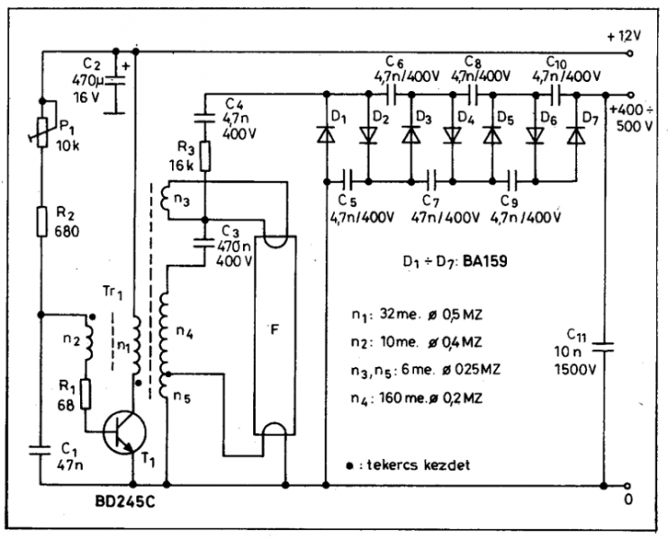 Ez a kapcsolás az 1997-es RT évkönyvben van benne. Ott fazék mag volt a trafó, aminek az AL értéke 630. A Freki 20KHz volt 6W-os égő fénycső esetén.