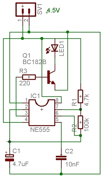 Ez a kapcsolás szerintem nem korrekt. 4.5V-ról táplálva is el fogja pusztítani a LED-et. Kéne egy ellenállás a LED-del sorbakötve.