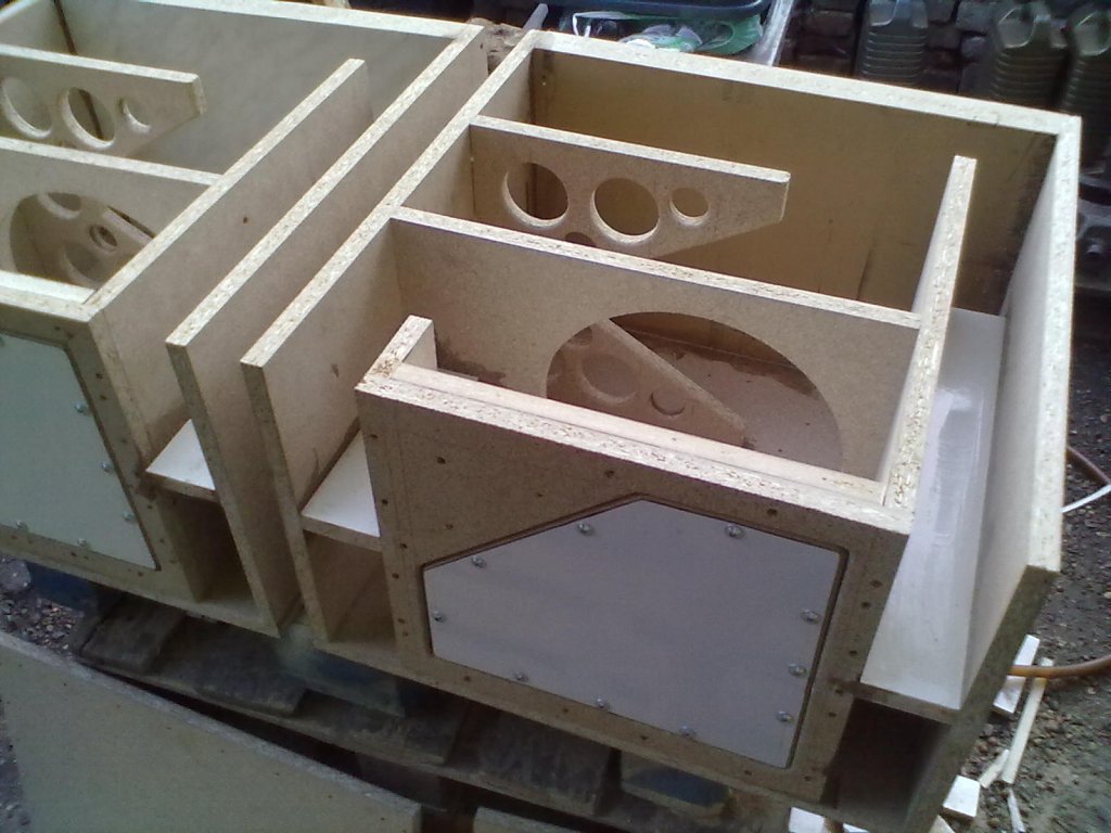 Még csak a lyukak vannak lefestve meg a belseje, most jön a csavarok gittelése és a festés majd a teljes végkifejletről is mutatok képeket. A hangszorókat az elején lehet berakni. Most még csak két THE VOICE hangszoró van bennük de majd BEYMA 12G40-et teszek bele ha összejön. Ez a láda a KV2 AUDIO KX1.2 terv alapján készült kisebb módosítással. kellenek még fülek, csatlakozók, és kerekek a hátuljára mert olyan 40kg 1db. |