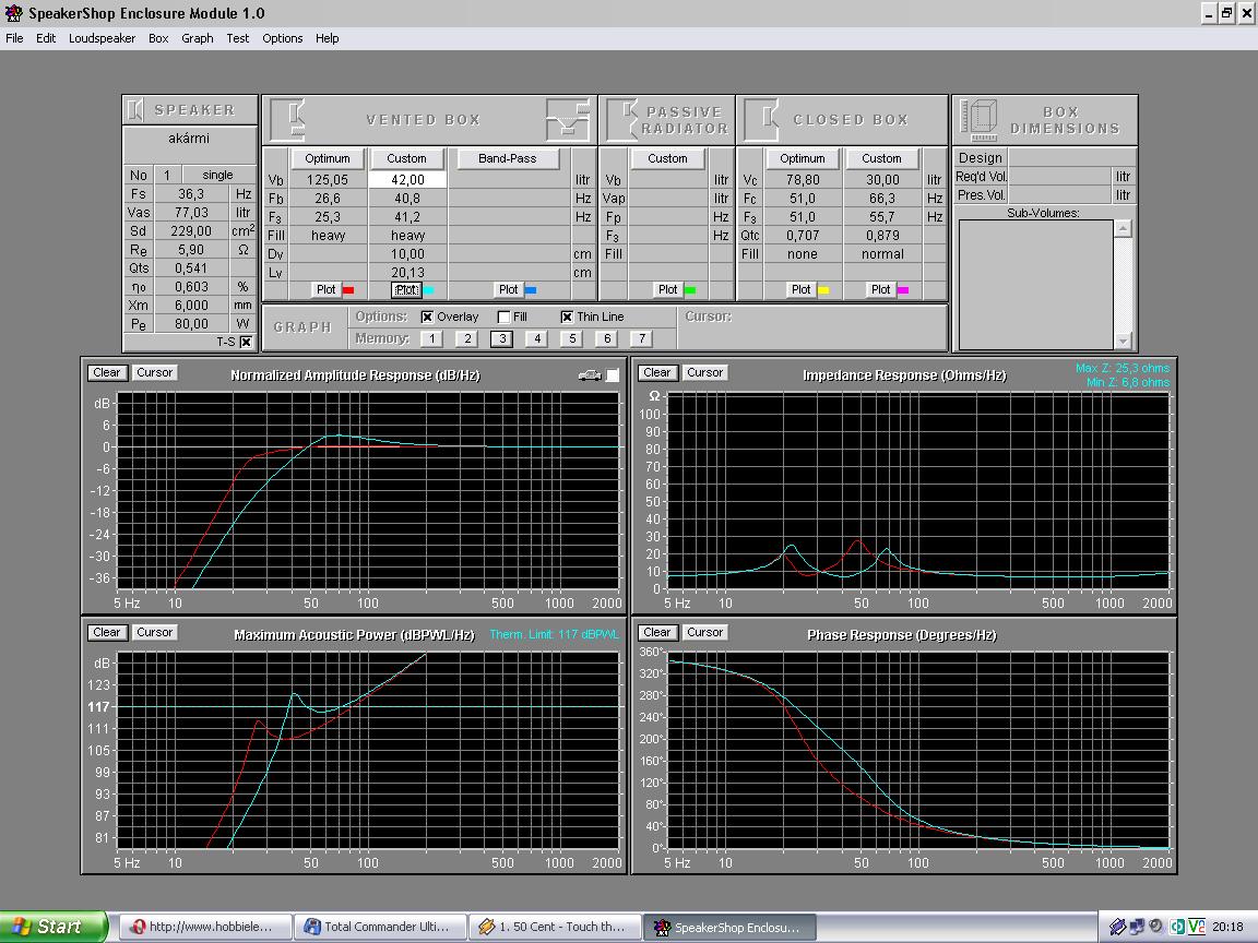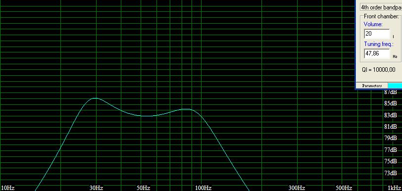 olvastam az előző hsz-aidat, nem vonom kétségbe, hogy értessz az akusztikához, de mi a probléma a 4. bandpassal? én is ilyet csináltam othonra, 13cm-es hangszóróval , az egész doboz nem nagyobb 20l-nél, (kép) szerintem mozizásra nincs ennél jobb! ok, hogy szűk a sávszélesség, dehát kit érdekelnek a 100Hz fölötti hangok? (mondjuk ez személyes vélemény) nekem nem tetszik ha pl egy mélyebb szinkronhang a fülembe dörmög, egy szub csak akkor szóljon ha effektek vannak a filmben. pl robbanás, stb milyen ez a JBL- progi? mert ha jó akkor lehet, hogy átállnék a winisd-ről, mert ez néha elég nagy marhaságokat számol üdv