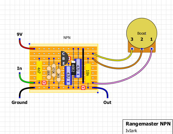 Ha torzítást szeretnél dúsítani, akkor javasolt egy nekem nagyon bevált holmi: a Rangemaster. Viszont a be és kimenő kondikkal nekem sipítozósnak tűnt, ezért 10nF be és 15nF ki kondit raktam nekik, egy AC187 Germánium tranzisztorral, így kapva egy gyönyörű, krémes középhangot!