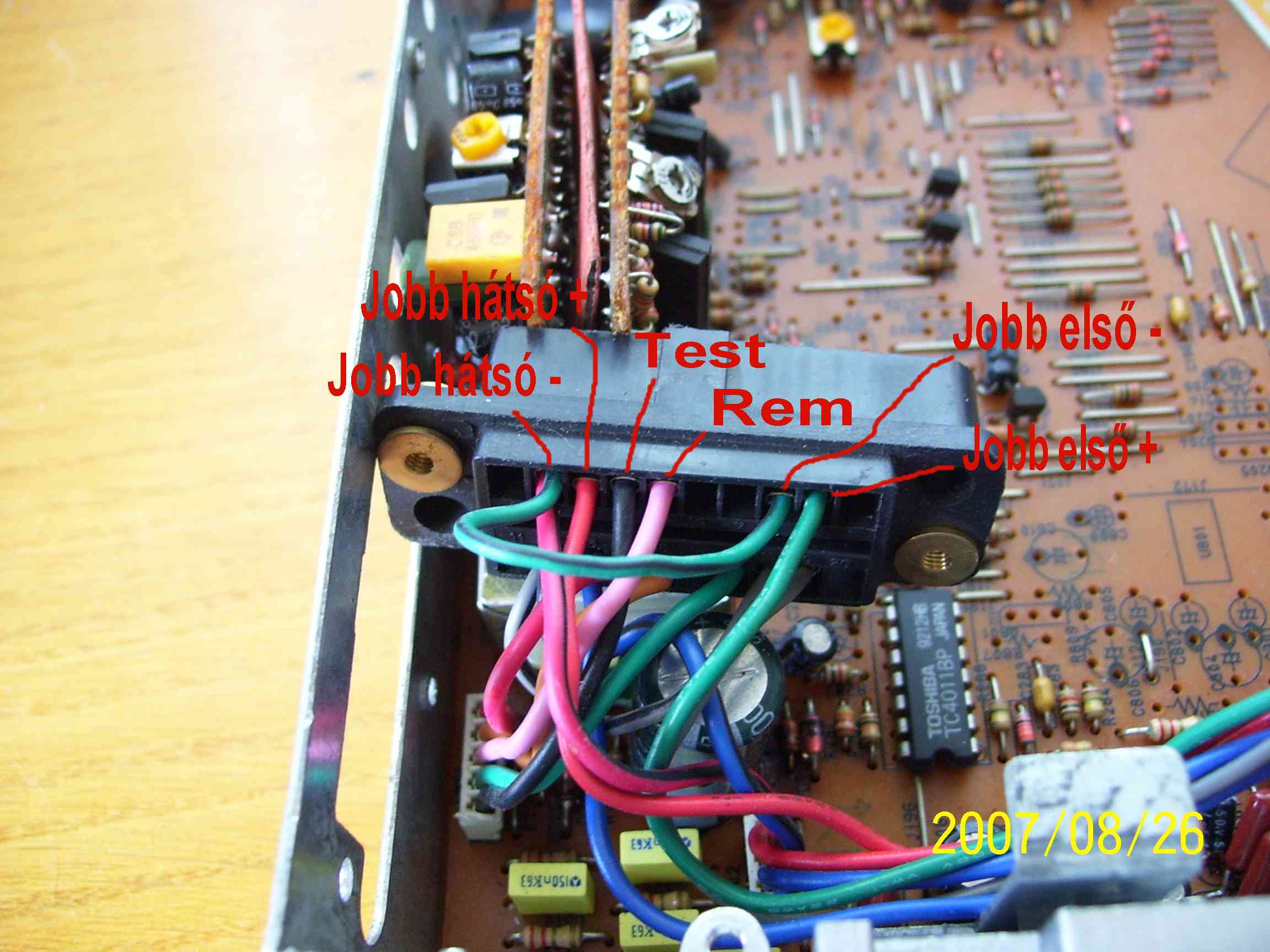 B+ - Piros = +12V állandó (aksi) BUp - Narancs = +12V kapcsolt Rem - Rózsaszín = +12V kapcsolt jel, pl erősítőhöz(neked nem kell) RRe = Jobb hátsó + LRe = Bal hátsó + RCom = Bal - LCom = Jobb -