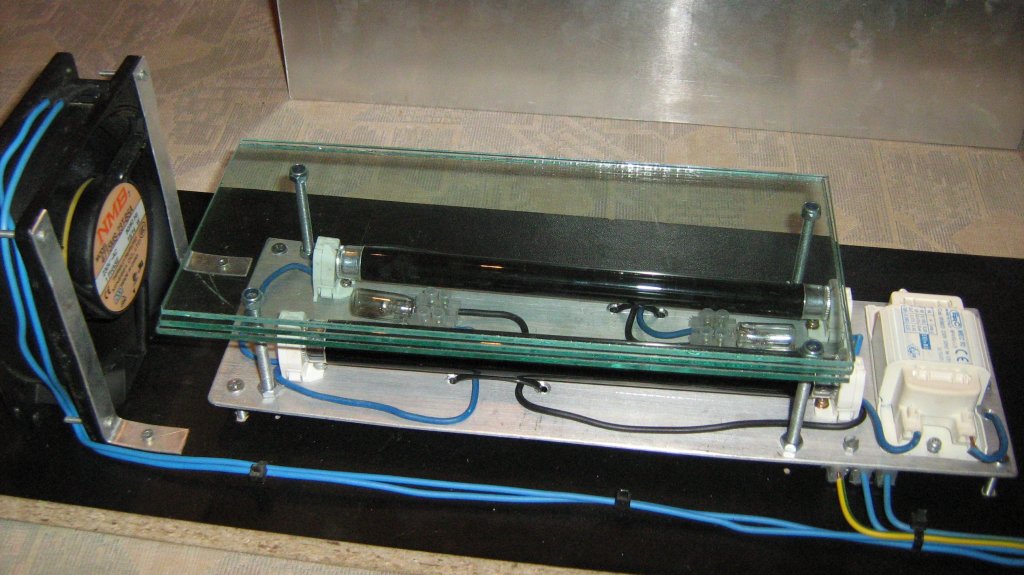 Nemrég meguntam a vasalásos nyák készítést. Ki akartam próbálni a levilágítást. Építettem is egy levilágítót (Nem lett túl komoly) Az üveglapok közül az első a kvarc üveg a másik kettő csak a súly miatt. És hajtottam neki egy Alu burkolatot is ,hogy ne zavarja a szemet.