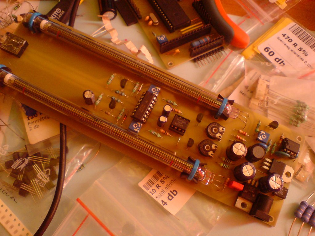Megépítettem az IN-13 plazmacsöves kivezérlésjelzőt, ahol a panelon vannak a csövek is. Érdekes látványt nyújt, jó kis kapcsolás. Elsőre indult, bár az erősítést állító 100K trimmereknél csak az egyik végállás végénél indul meg hirtelen a szemmel látható változás. A nyákterv ebbea topikban van.