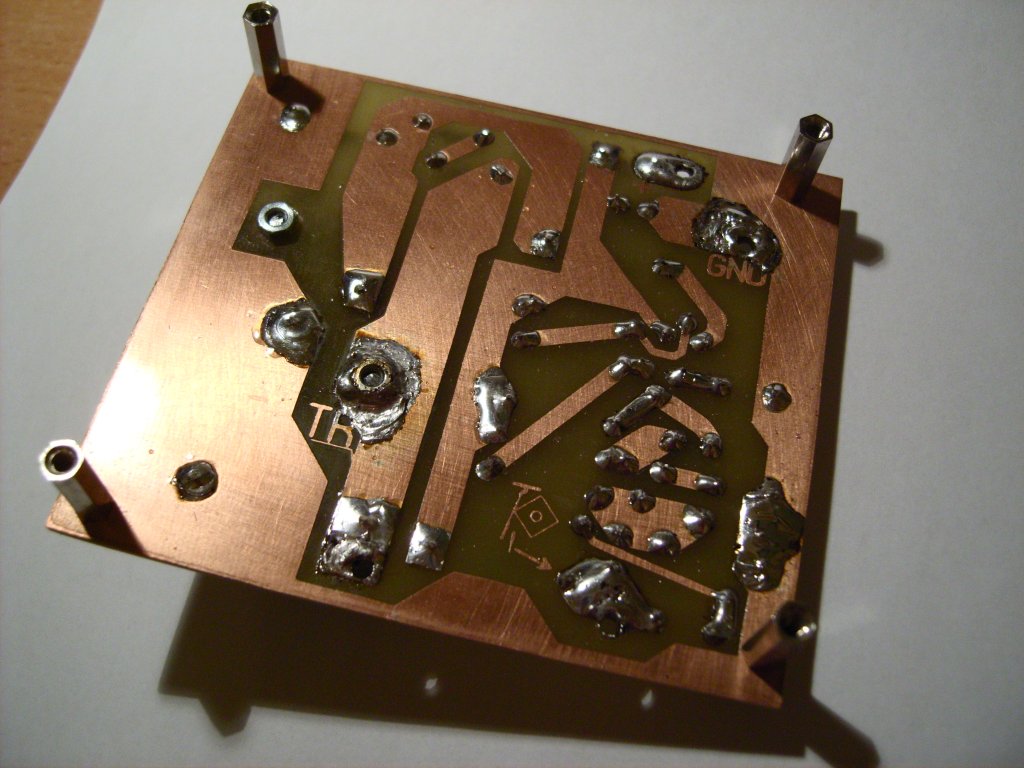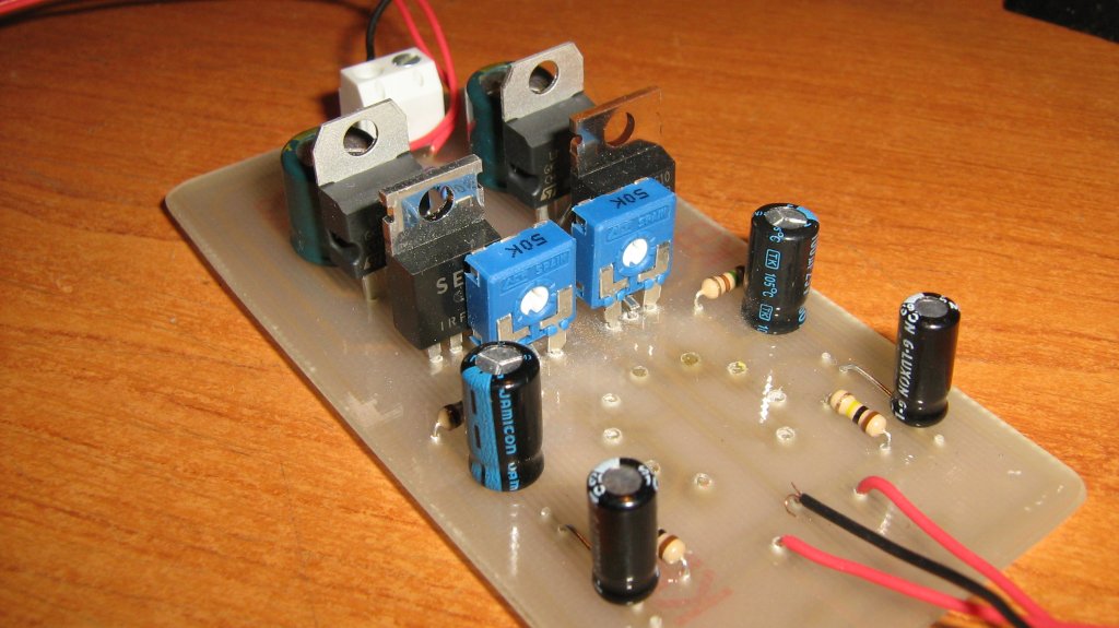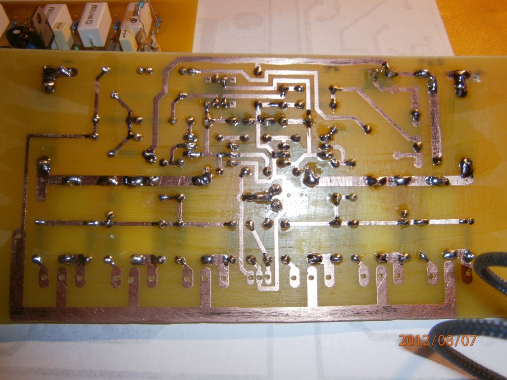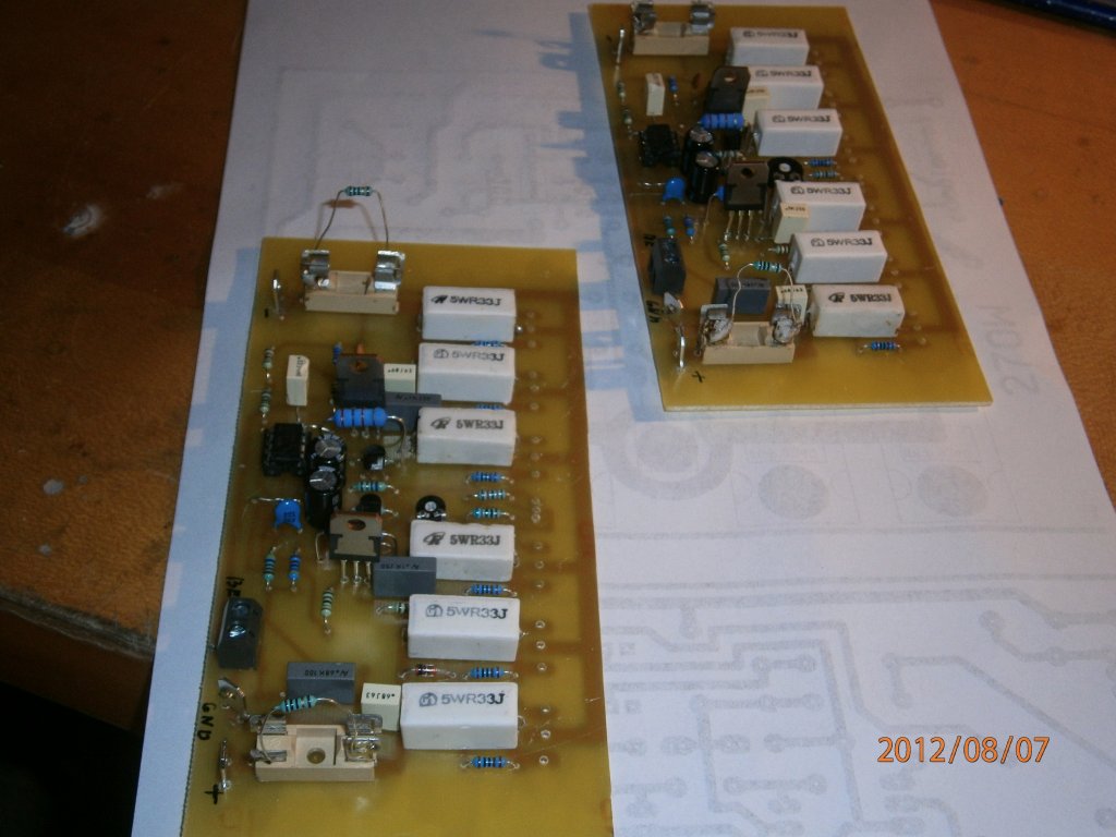 Elsőre indult, bár az erősítést állító 100K trimmereknél csak az egyik végállás végénél indul meg hirtelen a szemmel látható változás. A nyákterv ebbea topikban van.