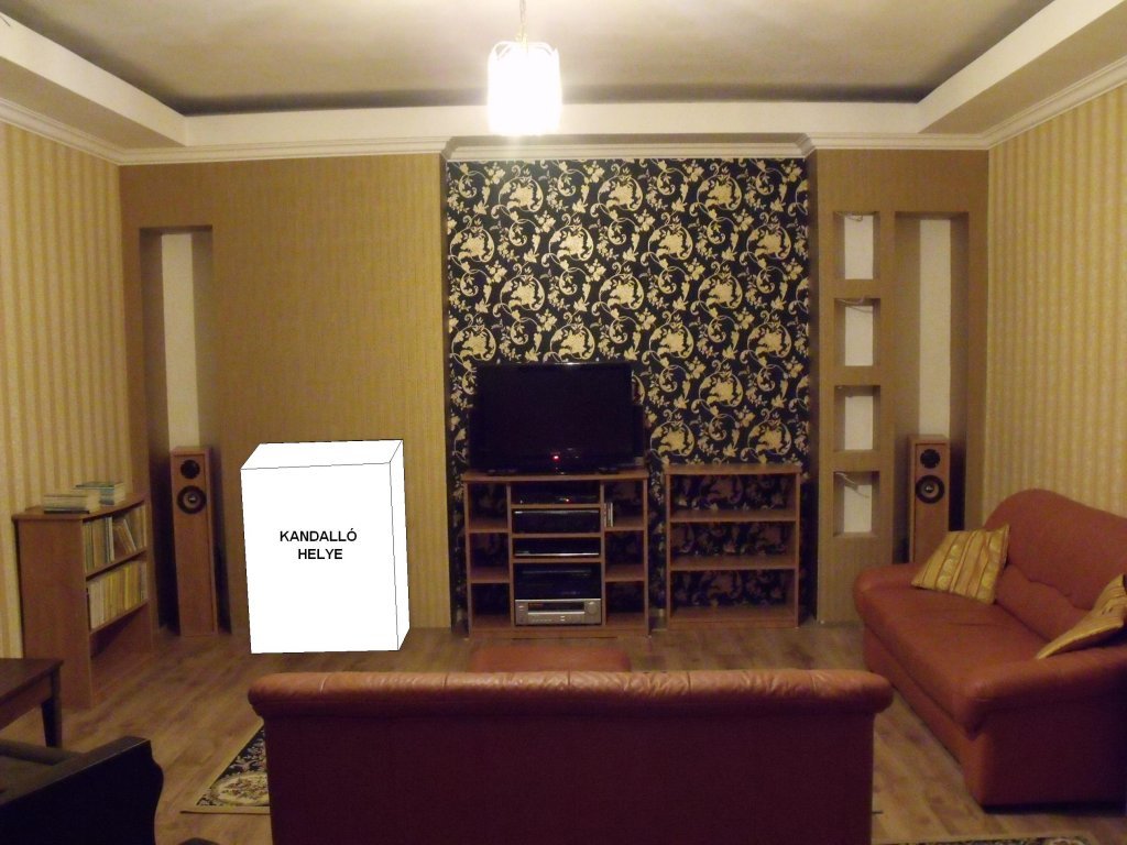 Nos, akkor következzen itt egy fotó a jelenlegi állapotról. Itt már majdnem kész a belsőépítészet. Sőt már több minden is van azóta, mert kb. két hetes a kép. Tegnap, a multifunkcionális nappali, mint diszkó debütált elsőként. Képek a OFF-ban lesznek a buliról. Nem ment még minden fény (nincsenek még beszerelve), de a hang már tökéletes. Persze, nem a képen látható hangsugárzók szóltak. Nagyon jó volt az akusztika. Egyenletes mélyek, semmilyen zavaró kiemelés vagy kongás. Rezonanciából keletkező hangok sem szólaltak meg. Tehát, a terem a hangpróbán átment. Most már jöhet a vetítőrendszer beszerelése. Valószínű, hogy azt már a Jézuskával összebeszélve Karácsonyra időzítem.