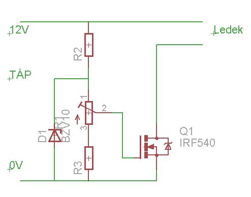 A fet ha a nyitó tartományába kerül,tulajdonképpen egy vezérelhető ellenállásként használható.Az alkatrészek értékeit nem igazán tudom.A zenert úgy válaszd meg hogy a max fényerő legyen éppen a ledeken (közel 0 a FET-en) az alsó ellenállással a min fényerőt tudod beállítani.
