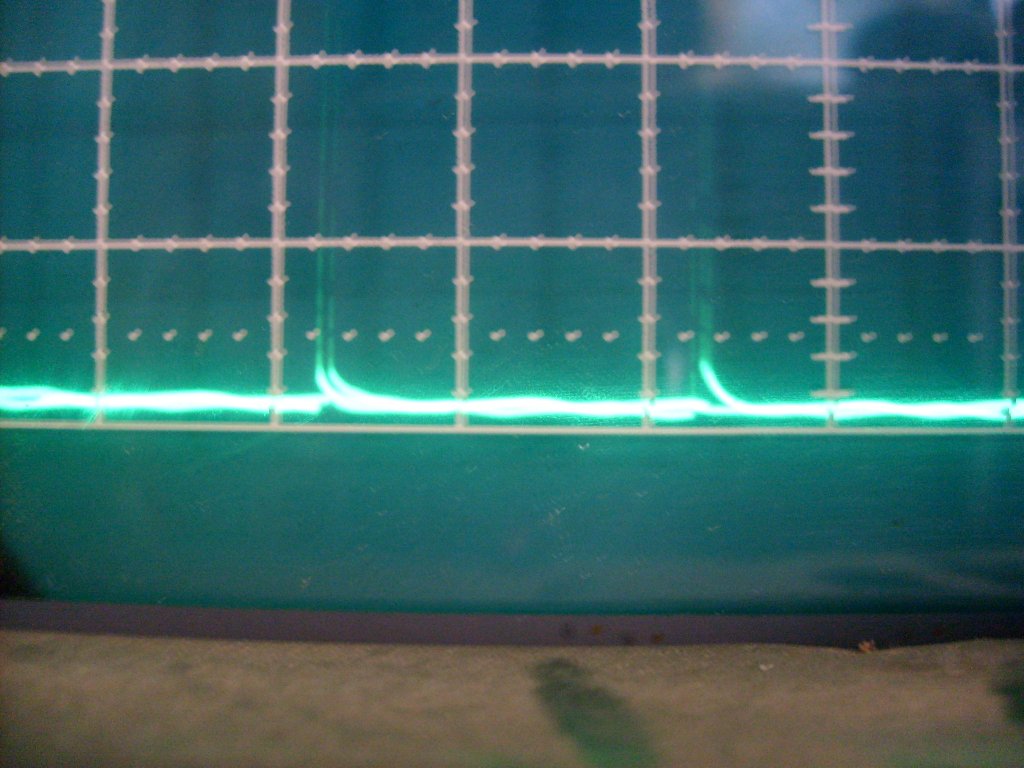 Nah, felraktam egy BY299-es diódát anóddal a 15-ös pont felé, megigazítottam a testelését a trafónak, mert volt 0,3ohm ellenállás az 1es pont és a test között. Most már jó. Az óra viszont továbbra sem mér. Mivel a szkópom nem túl pontos, nem tudok szép szkópképeket készíteni, de itt van néhány, hátha valamire rá lehet jönni belőlük. Az első 555 2-as lábán van ez a jel. Ahogy elkezdem pörgetni a motort, szépen csökken a periódusideje, tehát a mérés elvileg helyes. Az osztás 0,1V/div, de látni a felfelé menő tüskéket. Akkor most hogyan tovább? Ezek pozitív tüskék, nem negatívaknak kellene lenniük?