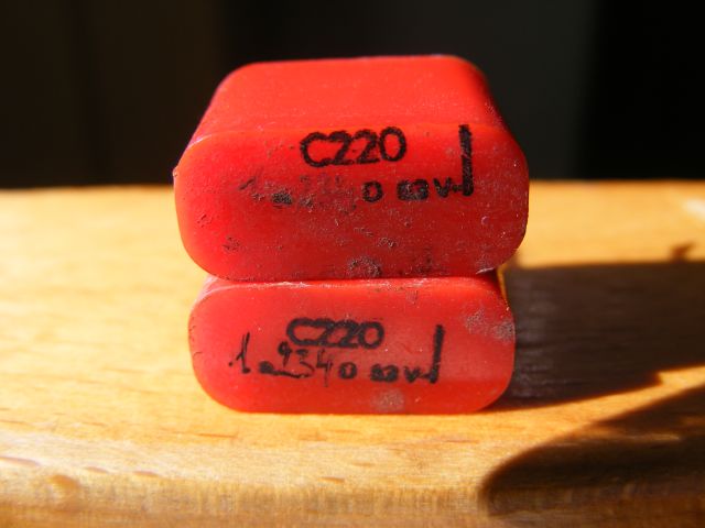 A régebben kapható helyett a képen láthatóakat sikerült beszerezni a helyi boltban. A nagyobbik MKP Y2/X1 6 raszteres mint a régebbi viszont vastagabb és drágább is (200 Ft). A kisebbik MKP X2 4 raszteres (kisebb mint az eredeti, viszont szintén 50 Ft) egy kicsit bizalmatlan is voltam vele, de mérések szerint semmilyen különbség nincs a lét kondi vesztesége között, 400 mV (csúcstól-csúcsig) körüli feszültség volt velük elérhető a fazékvasmagos tekerccsel, ugyanakkora mint a korábbi beszerzésű kondival volt.