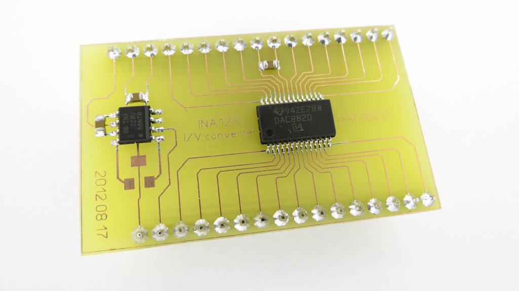A főbb alkotóelem a 16bit-es DAC, mellette pedig az I/V átalakítóhoz szükséges műveleti erősítő. Adatlap OPA277-et ajánl bele, nekem csak ilyenem volt. A három üres pad egy SMD trimmernek van meghagyva. OPA277-nél offset kompenzálási lehetőség, az INA esetében viszont egy ellenállással lehet beállítani az erősítést, így kihagytam. Próbapanelbe készült konstrukció! ![]() szerk.: Arról mág megfeledkeztem, hogy összetolja a képet a fórum... -> Eredeti méret <-