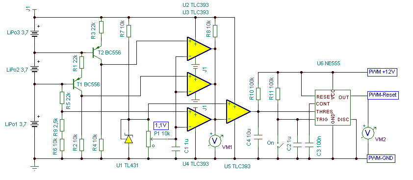 Pucuka leírta, hogyan készül a hiszterézis, és mire használható. De.. - Ez a rajz, csak egy áramkör részlete, ami szemlélteti, hogyan lehet cellánként figyelni az aksi feszültségét. Mivel nem írtad le, hogyan használnád, és mi módon avatkozik be, nem is rajzoltam hozzá semmit. - A hiszterézis, a ki és bekapcsolási pontok közötti feszültség különbség. Jelenleg ebben az áramkörben nincs hiszterézis, vagy is a ki és bekapcsolás, ugyan annál a 3V-os feszültség pontnál lesz. - Ha menet közben egy cella feszültsége 3V alá esik, akkor kikapcsol a védelem. De mivel ezzel az aksi terhelése is megszűnik, a feszültség egyből 3V fölé megy, és vissza is kapcsol. Vagy is "kapkodna" a motor.. Mert oké, 3V-nál lekapcsol. De milyen feszültségnél lehet visszakapcsolni? - Tehát itt nem biztos, hogy a hiszterézis lenne az üdvözítő megoldás. Lehet jobb ha az információt tároljuk, pld. egy RS tárral. Ezt ha elindítjuk a motort, bebillentjük, és ha egy cella leesik 3V alá, visszabillentjük. Vagy is újra elindulni akkor fog, ha ismét megnyomjuk a gombot, vagy is töröljük a hibajelet. - Szóval rajzoltam hozzá egy RS tárolót, amit egy 555-ből alakítottam ki. Ennek kimenetét ha rákötöd a PWM Reset bemenetére, feszültség csökkenés esetén kikapcsolja a PWM jelet. (Gondolom a PWM-nél is van tiltás, ha nem, akkor egy relét használsz az 555 kimenetén.) A PWM csak akkor fog újra megjelenni, ha megnyomod a gombot. Az utolsó komparátor, most csak invertálásra szolgál. Viszont kimenetén a 10µF-os kondi biztosítja, hogy letiltani a feszültség csökkenés csak akkor fogja a PWM jelet, ha a csökkenés legalább 1 másodpercig fennáll. Az 555-nél a TRIG lábnak THRES lábbal szemben elsőbbsége van, tehát a GOMB nyomásakor, akkor is engedélyezi a PWM működését, ha a feszültség ekkor alacsony. A rajzot egyébként a TINA demo verzióval készítettem, pontosabba szimuláltam. üdv! proli007