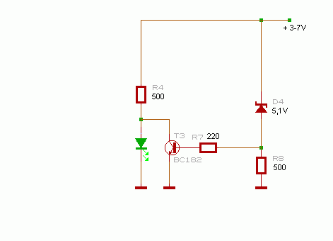 5V alatt világít a led, afölött pedig nem. ..de ugye nekem ez nem jó, mert egy 3v-os zener kell, a tranyó pedig az anódot kapcsolja, a katód rajta van a negatívon fixen. nekem pedig a negatívot kellene kapcsolni.