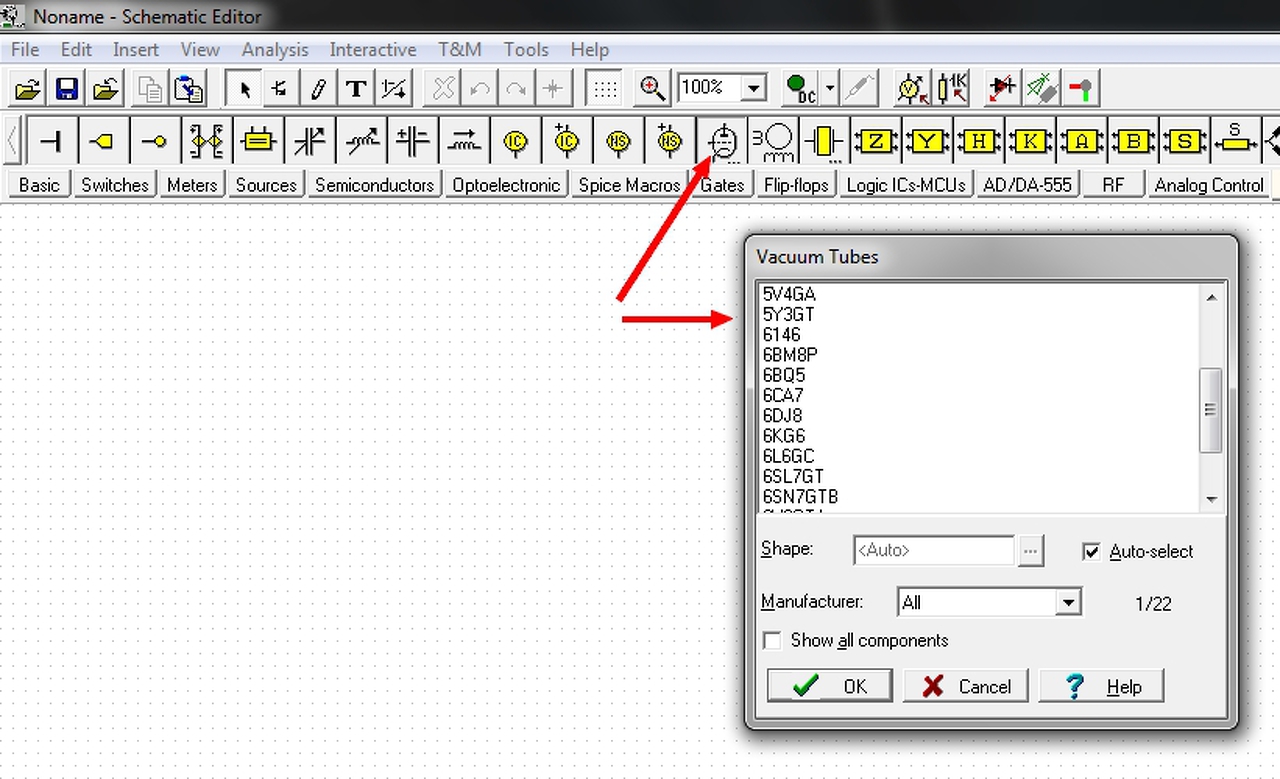 A basic csoportban rögtön a harmadik a telep, de mellette jobbról balról ott vannak az egyen és váltakozó feszültségű generátorok, amiknek a feszültsége tetszőlegesre állítható, a teleppel együtt. Csatoltam néhány képet amin látszik hogy hol van az analízis menü, hol vannak az alkatrészek amikre még név szerint is lehet keresni, és - bár a 21. században az embernek hála Istennek már nem kell velük foglalkozni - de még csövek is vannak.