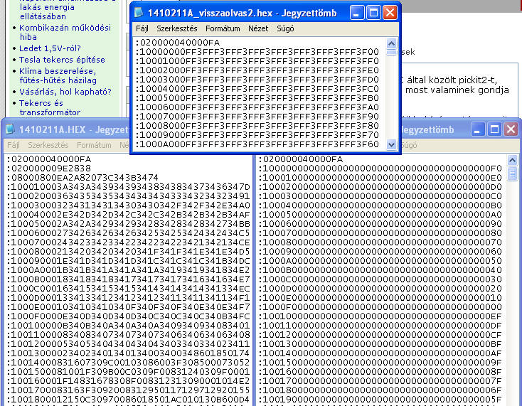 Korábban megépítettem a Hp41C által közölt pickit2-t, sikeresen égettem is már vele és most valaminek gondja támadt. 16f88-t szeretnék égetni. Az égető a picet felismeri.A hex fájl behívása után, a write nyomógombra kattintva jelenti, hogy az írás kész. Visszaolvasva a picet csupa 0 van beírva.Törölve a picet, a visszaolvas2.hex-et kapom. Segítsetek megtalálni mi a probléma!