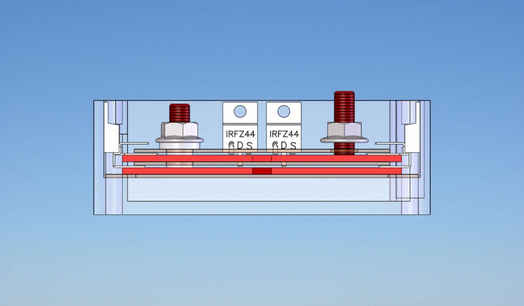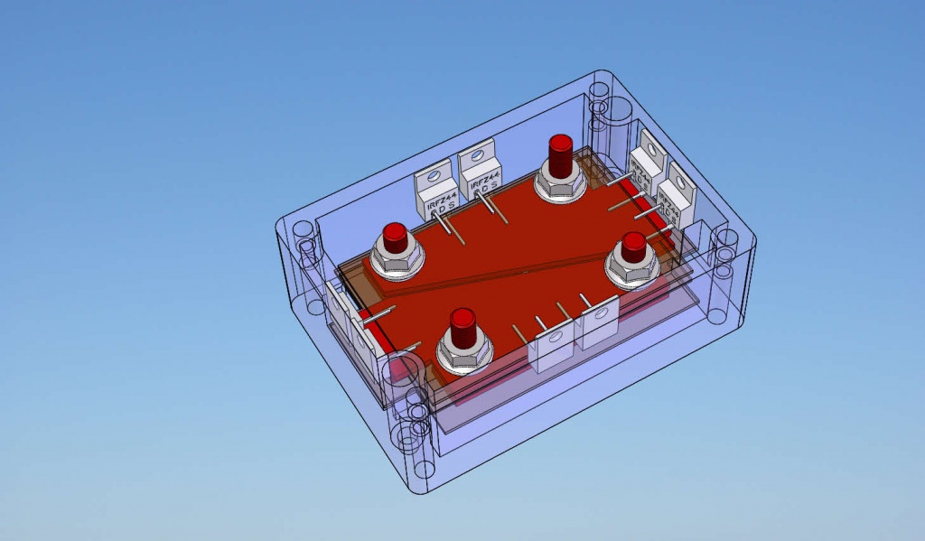 Elkészültem a nagyáramú híd mechanikai tervével. Szeretnék véleményt kérni, mert a hétvégén elkészíteném, amennyiben a hozzáértők jónak ítélik. A pdf 3d-s forgatható nagyítható kicsinyíthető. Kicsit sötét lett de ez most mellékes. Átlátszóvá tettem a bakelitlemezeket és a dobozt is. A doboz alu 70x100mm-es a piros lemezek 2mm-vtg vörösréz lemezekből vannak kialakítva. Szintúgy az M6 csavarok. A csavarok a furatban lyukforrasztással lennének rögzítve. Az egyik lemezen átmenő csavarok körül szigetelőgyűrű van esztergálva. mint a tranzisztor szigetelő gyűrű. A Fetek szigetelten vannak felszerelve a dobozra. A csavarok az átlóban a táp illetve a motor kivezetések. A vezetékek a rajzon nem látható fedélen lesznek kivezetve. A pic-es vezérlőrészhez szintén a fedélen RS232 es csatlakozóval készítek kivezetést. A hídvezérlő nyákja a csavarok között lesz hosszában. A gatekre ferritgyűrű lesz húzva. Ez a kivitelezés már megfelelő lehet? Kösz ha válaszol valaki.
