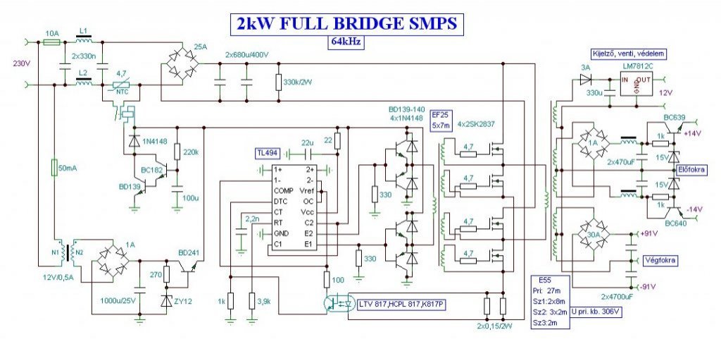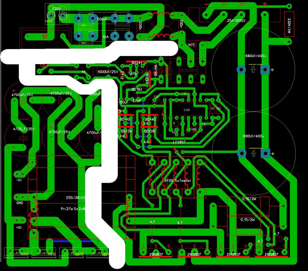 Azt még véltem felfedezni, hogy az 1-es és a 3-as 2SK2837 mindkét Fet lába ugyebár a közös Drain középső lába alul is meg felül is össze kötöttem szerintem felesleges, bár annyi hiba legyen, utólag ha majd mindenki gondolja, vagy felül hagyja meg a vonalat,(+ág) vagy alul az áthidalást választja. Közvetlen az EF25 jelű trafó felett látni, hogy ott is van egy felesleges áthidalás. Valamelyiket törölni lehet.