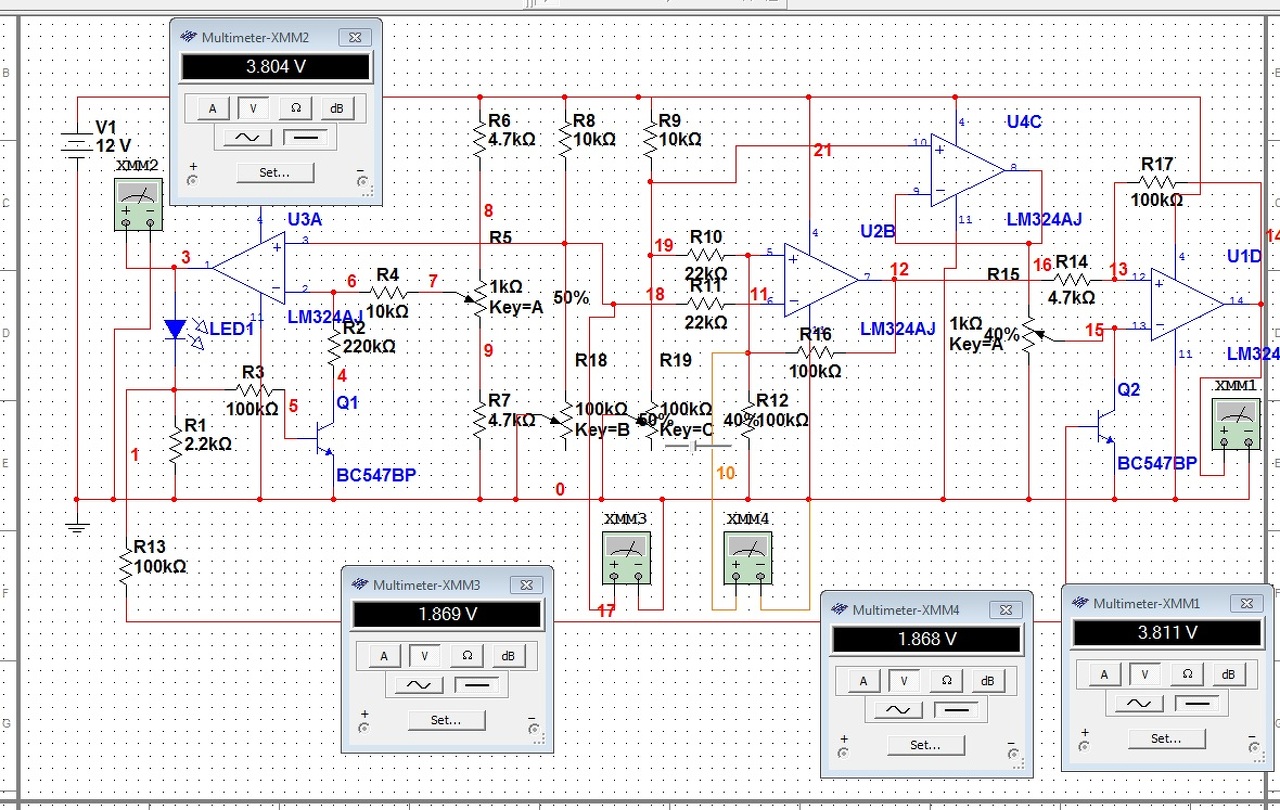 -Az OP4 kimenete mindig 3,8V körül van akármit csinálok. Az OP3 kb ugyanannyi. Az NTC-ket 100k-s potikkal helyettesítettem. Az NI Multisim progiját használtam. Becsatolom az áramkört hátha te rájössz hol rontottam el.