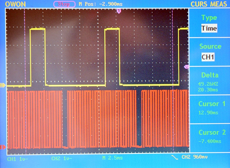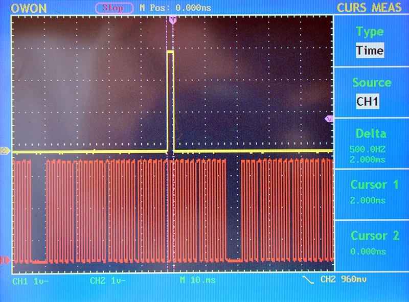 A héten írt programkódot teszteltem le. Két fordulatszámot próbáltam ki. Azt hiszem 1000-es és 6000-es fordulatra volt beállítva a négyszögjel generátor, ami az üres fogat is szimulálta. 34 fog, 2 üres fog, így egy fog 10 foknak felel meg. Ezt a négyszögjelet kapta meg a PIC (a szögjeladó átalakítása után ugyan ilyen jel lesz) A PIC egy kimenetén pedig az egyes henger gyújtótrafó fokozatának adta a jelet. A program táblákkal dolgozik. Van egy fordulat terhelés tábla. Innen veszi ki az előgyújtás értéket. Ez az egyszerűség kedvéért 20 fokra volt beállítva- Van egy offset, ami megmondja, hogy felső holtponton hol áll a szögjeladó első foga. Ez is el volt tolva 110 fokkal. A dwell értéket is táblából veszi. Ez az akkumulátor feszültség függvényében változik. 14V-on 2000us értéket vett ki a táblából. Ami látszik az ábrákon, hogy a zárszögvezérlés jól működik. Mindig 2000us függetlenül a fordulatszámtól. A gyújtástrafó vezérlését pedig mindig a megfelelő helyen engedi el. A hozzászólás módosítva: Szept 1, 2012
