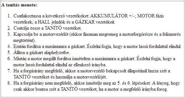 Akitől kaptam a vezérlőt, annál nem volt összedugva a két fehér vezeték,Nálam is működik így de azt veszem észre hogy a gázkar behúzásának kb felénél leáll a tovább gyorsulás ,és teljes feltöltött aksival terhelés nélkül kevésnek találom a kerék fordulatszámát. Még nincs összerakva teljesen ezért rendesen ráülve nem tudtam kipróbálni A képeken láthatod hogy hol olvastam az öntanuló funkcióról