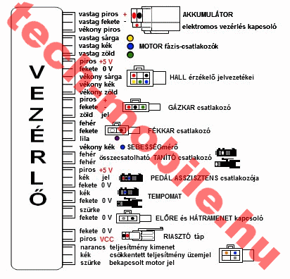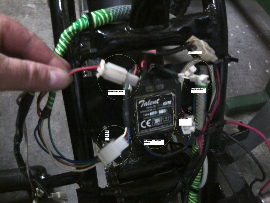 Sajnos a kép nem túl jó minőségű,de jelöltem rajta hogy mi hova megy. Ma kipróbáltam a fehér kábeleket, ha összedugom akkor felére visszafogja a sebességet,egyébként forgásirányt nem változtat. A38.5 V-ra feltöltött aku teljes gázon 37,5-re csökkent ,majd nagyon lassan fokozatosan tizedekkel csökkent. Egyébként a sebességkijelző 25-30 kmh t mutatott , ami szerintem ennek a konstrukciónak a maximuma. Ha már egy kicsit elkezdtem fékezni, ( csak sztenderen próbáltam ki) azonnal elveszik a motornak a nyomatéka