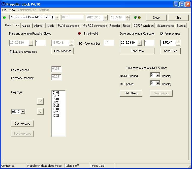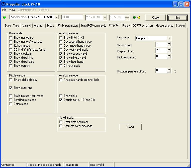 Végre, akadt egy kis idő a továbbfejlesztésre: A kezelő programon is alakítottam. Megszüntethető a rotor parancskódolási bonyodalma. A kommunikáció lehetővé teszi, hogy az összes parancsot a bázis vegye, dolgozza fel és továbbítsa a rotornak. A beállításokat ezután a bázis RTC -je tárolja, de lehetőség van/lesz állományba való mentésre is. Időkezelés: Automatikus téli - nyári idő átállás, +1..-1 órás zóna eltérés kezelése a DCF időhöz képest. Ébresztés: Ünnepnap kezelés (Húsvét és Pünkösd is), páros páratlan (ISO) hét kezelése. Kontroller típustól függően 20 vagy 40 ébresztési időpont. PWM: Rotor fényerő és sebesség szabályzás (időzített és fénymérésen alapuló is), DCF77: Vételi statisztika 24 órára visszamenőleg. System: Programból állítható infra kódok, soros vonali sebesség, TxD és RxD polaritás (ha a kontroller támogatja). Közös kezelő program az összes kommunikációra képes bázishoz (USB és a soros porttal rendelkezőre is): USB: 16F1459 (végre belefért), 18F14K50, 18F2550, 18F2455 Soros: 16F1825 (belső órajel miatt DCF77 szinkronizálás szükséges), 16F1827, 18F1729, 18F14K22, 18F2420, 18F2520, 18F2620. A hozzászólás módosítva: Szept 10, 2012