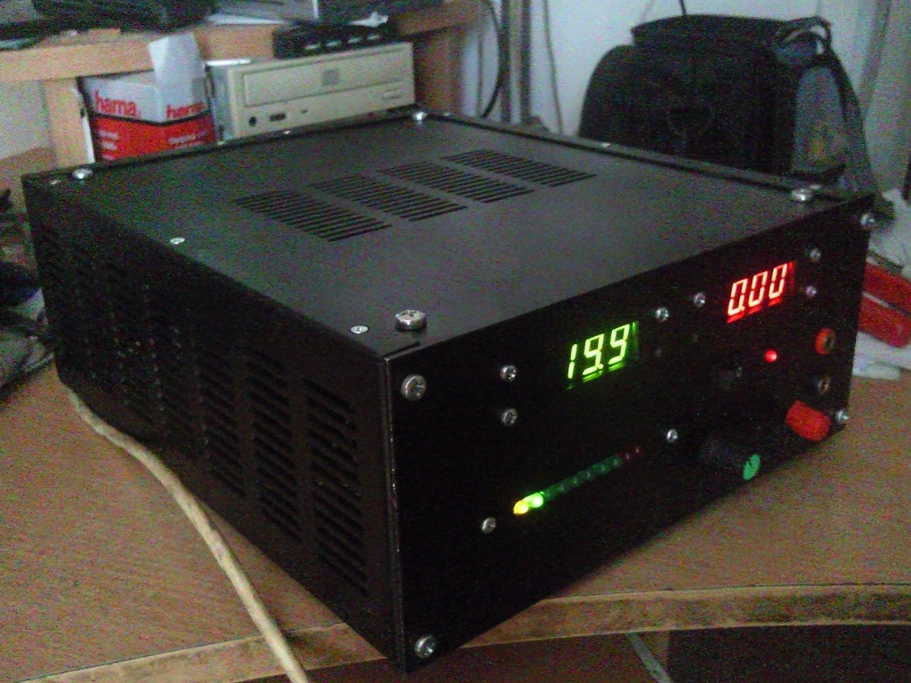 Nagyon szép munka! Ha megengedsz egy-két kritikai észrevételt is - csak a dobozolásra: Süllyesztett csavarokkal máris szebb lenne, vagy lehetne rejtett hátsó oldali csavarozás mint az én tápomon. Ez azt jelenti, hogy nálam például a kijelzők úgy vannak felerősítve az előlapra, hogy hátulról m3-as menettel fel van ragasztva egy 5mm-es plexi. Abba csavarom a panelek felerősítő csavarjait. 1989 óta éve bírja a technocol rapidos ragasztás. Így az előlap felől semmi nem látszik, homogén az előlap. Nagyon megtetszett ez a megoldás akkor, szinte gyárinak hat az előlap emiatt. A ki-bekapcsolód is egy kicsit játékszernek hat. Nem is túl szerencsés egy nagyobb trafónál. Komolyabb berendezéseknél - mint a tiéd is - egy kismegszakító simán lehetne, vagy 16A 6kA megszakító képességű kapcsoló. Amúgy kifejezetten tetszik, mert kevés igényes munkát látok mostanában.