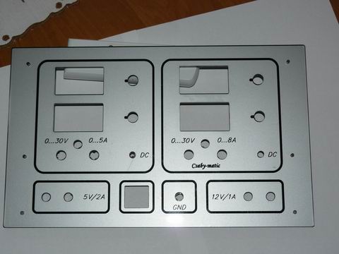 ArtCam nevű programban megrajzoltam mindent. Szó szerint, mert még a potik elfordulásgátlójának a helyét is. Beállítottam az egyes elemek mélységét, megtükröztem és kértem egy marási kódot. Nagyon kezes program, élmény vele dolgozni. A plexi egyik oldalát alkohollal zsírmentesítettem és lefújtam ezüsttel. Belemartam mindent és átfújtam matt feketével. Azáltal, hogy a fekete részek közelebb vannak, teljesen 3D-s lett. A tervezésre elment egy estém, a marásra a festésekkel együtt egy délutánom. Amire figyelni kell, hogy az ezüst ráfújása és a fekete száradása között már nem szabad megérinteni, mert megcsúnyul.