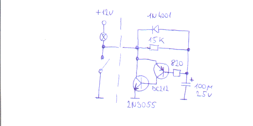 Sziasztok! Megépítettem egy elhalványuló utastér világítást az alábbi kapcsolási rajz alapján. Eléggé kezdő vagyok és csak kicsit értek hozzá. Igazából én autóvillamosság szerelő vagyok és csak átlagos tudással rendelkezek ilyen téren. A problémám az lenne h mikor "becsukódik" az ajtó akkor halványulás után még halványan parázslik az 5W-os izzo és nem alszik el. Esetleg valaki valamilyen megoldást tudna rá?