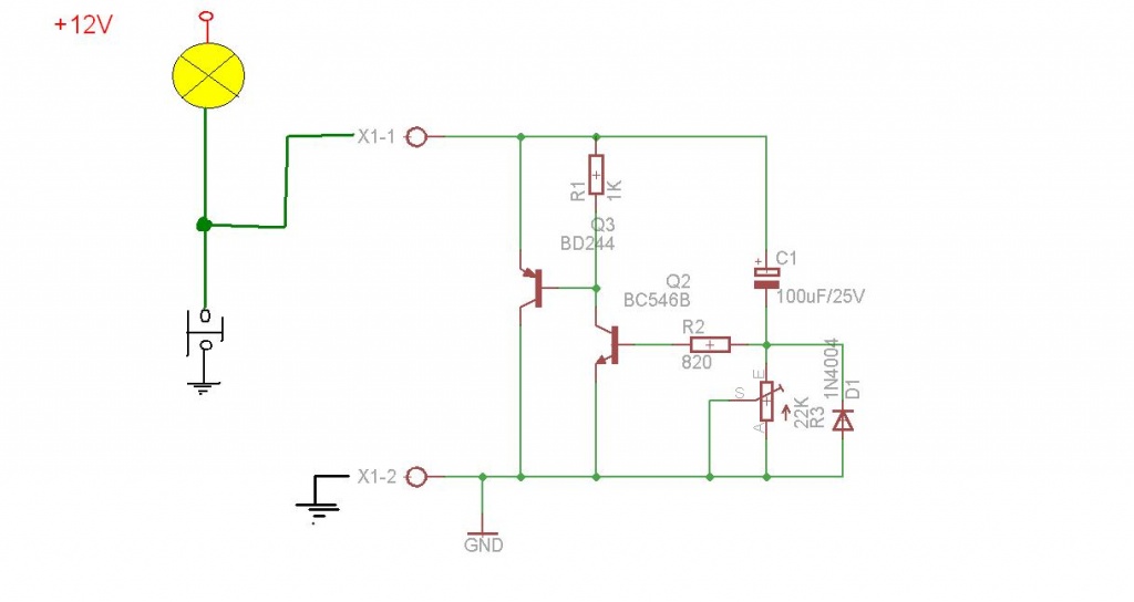 A késleltető úgy van bekötve, hogy meg van szakítva a test kapcsolóről az égőre menő vezeték. Külön tápfeszt nem igényel, tehát 2 ponton csatlakozik az áramkörbe. Ahány égőd van, annyi db áramkört építesz, és mind elé sorba kötöd. Arra vigyázz, hogy 5 W-osnál nagyobb izzót ne használj, hogy ne melegedjen nagyon az áramkör. Legyen BD243C, az bírja. Vagy ha van hely, akkor BD 245.