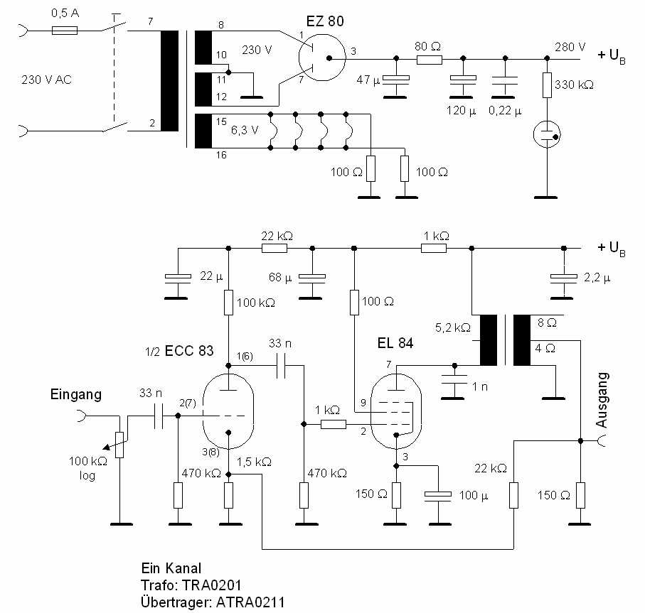 Ha sztereót szeretnél, akkor a két csatornára egy EZ80 kevés. Vagy kétszer építed meg a tápot, vagy a két EZ80-at úgy kötöd be, hogy egy cső egy ágat egyenirányít - párhuzamosan kötött anódokkal. Használhatsz EZ81-et, abból egy is elég.