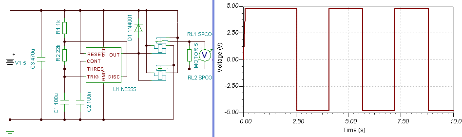 Ha relés is megfelel, akkor egy 555-ös astabil kapcsolásra kötöd a relét, aminek két-áramkörösnek kell lenni. pld. így ahogy a képen van. (végálláskapcsolók nem kellenek, annak helyét rövidre zárhatod.)