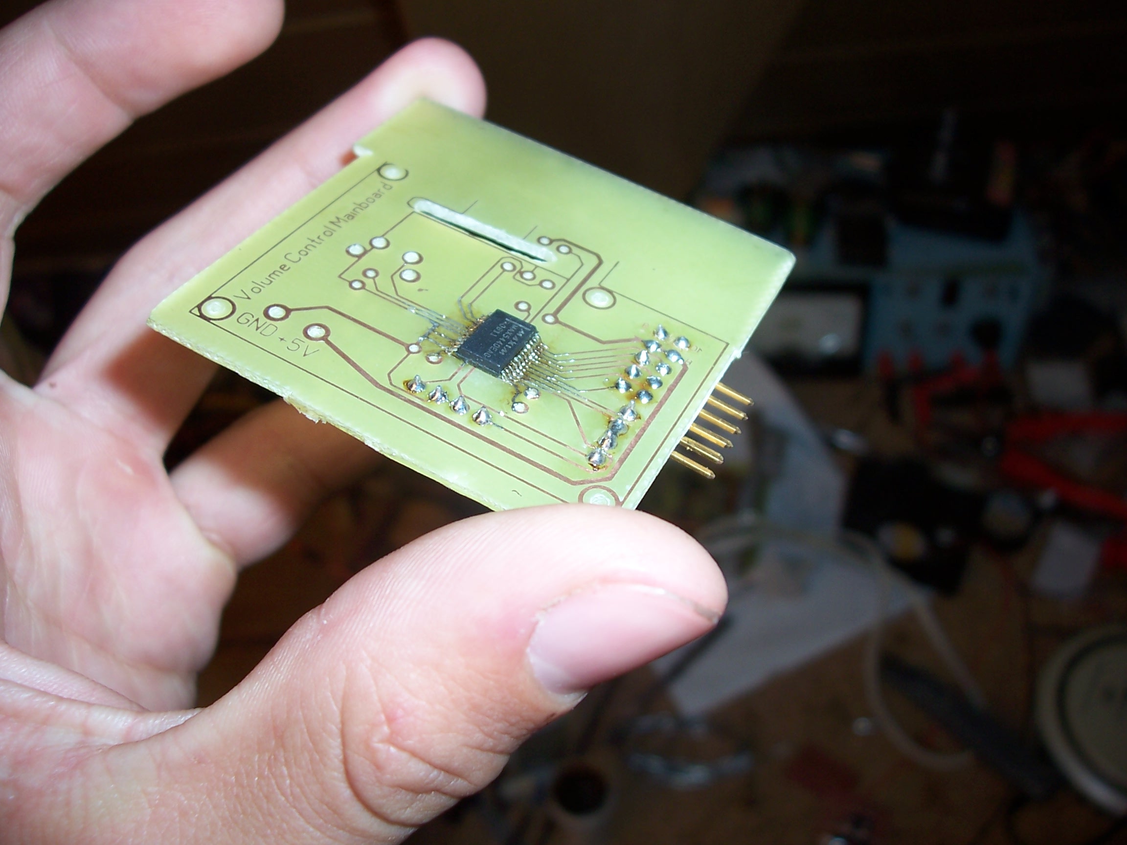 Itt vannak a fotók. az első kettőn az optikai enkóder félkészen, a harmadikon a vezérlő panel hangerőszabályzó MAX5440 IC