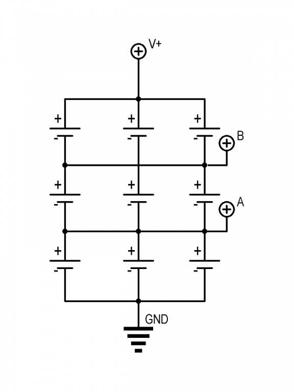 Az akkupakk 3x3 akkumulátorcellából van összerakva. 3-3 darab párhuzamosan, és ezek sorba vannak kötve, ahogyan a képen látható. A csatlakozóra mindegyik akkumulátorhármast ki kell vezetni, tehát föld (GND, negatív pólus, 0V), A (az első akkumulátor pozitív és a második akku negatív pólusa (3.7V), B a második akkumulátor pozitív és a harmadik akku negatív pólusa (7.4V), V+ a harmadik akkumulátor pozitív pólusa(11.1V).
