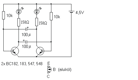 Oldalanként 3 LED. Ha változatlan sebességet akarsz, akkor a 10kOhm bázisellenállásokat növeld meg 27KOhm-ra.