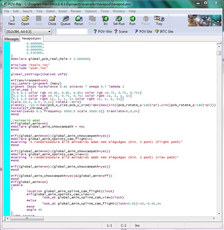 Azt úgy értem, hogy munka-fájlokat nem tartunk és nem hozunk létre a "C:\Program files ..." mappában. A képkivágás szerint, amit betettél az Eagle mappa alatt lett létre hozva a *.pov fájl és valószínüleg a kimeneti fájlt is ott akarta létre hozni, de nem tudta, mert nem volt rá engedélye. A Pov-ray\include helyett is mást választanék, mert egy idő után tele lesz mindenféle nem oda való dolgokkal.
