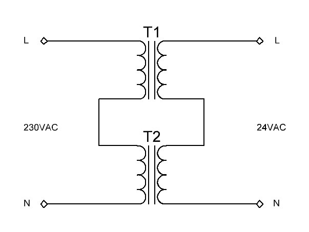 Ha sehol nem találsz, akkor, veszel két 230/24V-os 20VA-s trafót. Primert/secundert fázishelyesen sorba kötöd, és kész a cseppet sem melegedő állandó üzemű trafód.