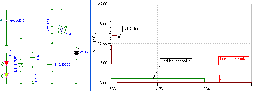Az egyik áramkör átkapcsol egy kondenzátort a telepről a csipogóra, a másik áramköre pedig a LEDeknek ad tápfeszültséget.