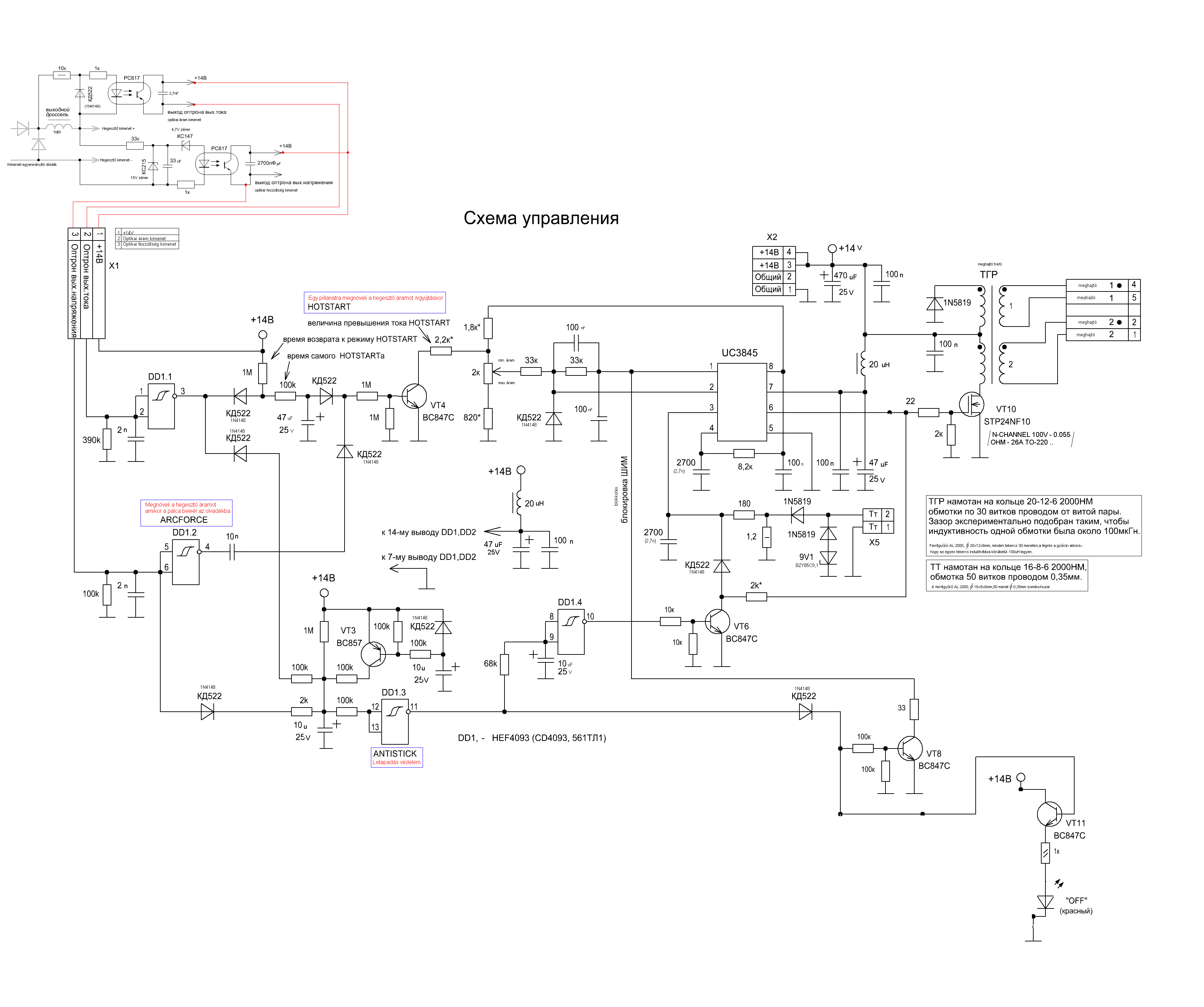 Az a kapcsolási rajz amit ide tettél nem egyezik meg azzal a géppel amit én csináltam! A drossel nek a + ágban kell lennie, ha azt a vezérlést használod amit én terveztem! a kisegítő áram körök miatt! ARC-FORCE, HOTSTART, ANTISTCKING