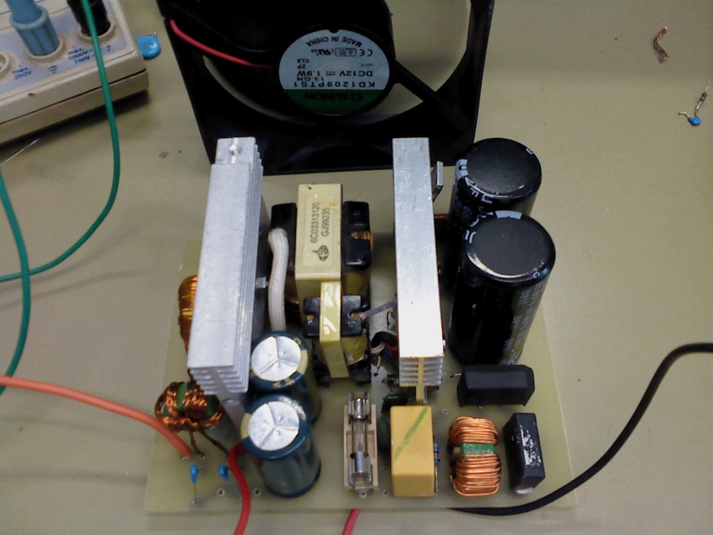 Az önrezgéshez való mag pici fekete, a tranyómeghajtó trafó mellett van. Az a kisebb zöld mag differenciál-zavarszűrőként szolgál. Szkóppal nézve a kimenetet, nem csak vezetett, hanem szórt zavarai is vannak, amiket összeszed a szkóp fej. Ha megfogom egyik vagy másik bordát (a nagy táp természetesen leválasztott), némileg csökkennek. De azt gondolom, nem árt a fém, árnyékolt ház neki + még a védőföld sem. Ki akarom nemsokára próbálni egy sima AB végfokkal (amit még én tervezgettem-méretezgettem régebben). Ekkora feszültségre (kb. +/-27V, ami a 350W mellett kijön a PC táp trafóból) összehidalom a két végfokot, és megnyúzom úgy, kíváncsi vagyok, mit alkot. A következő próbálkozásom FET-es önrezgő lesz, szórótrafóval, rezonáns kivitelben. És majd tervezem összehasonlítani a kettőt.