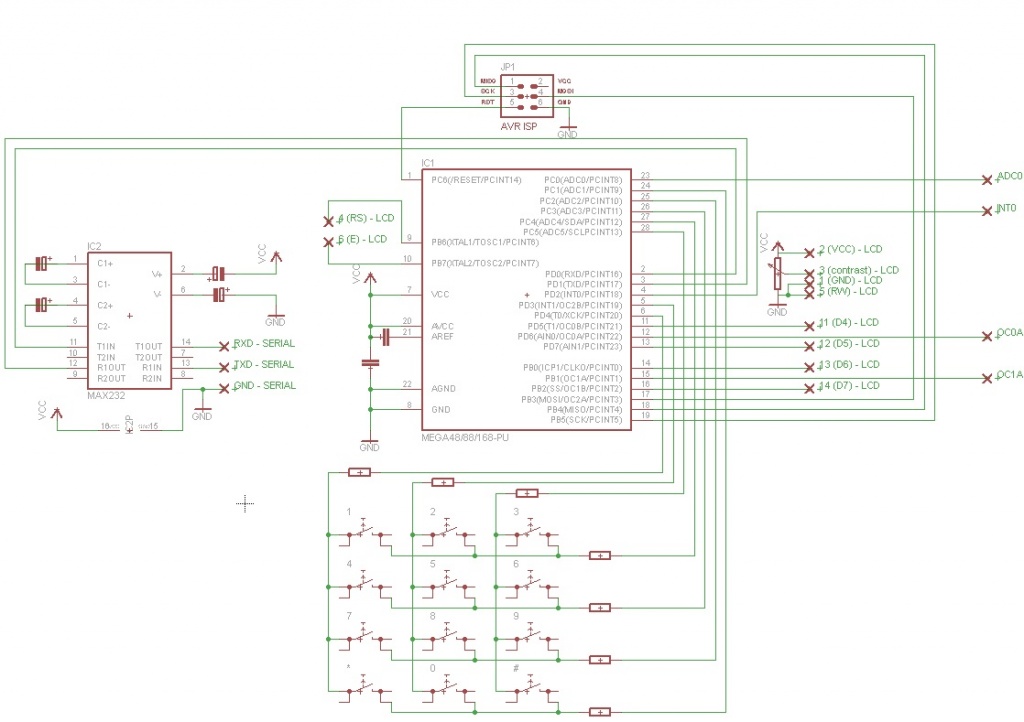 ebbe mindent összegyúrtam, a felesleges részek kihagyhatóak. pl. ha nincs szükség direkt kommunikációra az avr és pc között (vagy nincs soros port a pc-ben), akkor a max232 a körítéssel elhagyható, stb. az lcd bekötése olyan lcd modult feltételez, amely párhuzamos 4-bites kommunikációt tud (pl. a hestore-ban RC-1602-B néven futó lcd, vagy hasonló, azaz HD44780 kompatibilis vezérlős). - az ADC0 láb A/D converter (pl. shunt mérésre) - az INT0 hardveres interrupt (pl. impulzus számláló. viszont ha a pwm-et is ő csinálja, akkor ezen funkció nem szükséges) - OC0A és OC1A a timer0 és timer1 kivezetése (előbbi 8, utóbbi 16 bites - a clock-tól függően kell eldönteni, melyiket használjuk). ezzel lehetne előállítani a pwm jelet. ha a pc-ben van párhuzamos port, akkor nincs szükség külön égetőre, a megfelelő lábakat össze kell kötni, és lehet programozni.