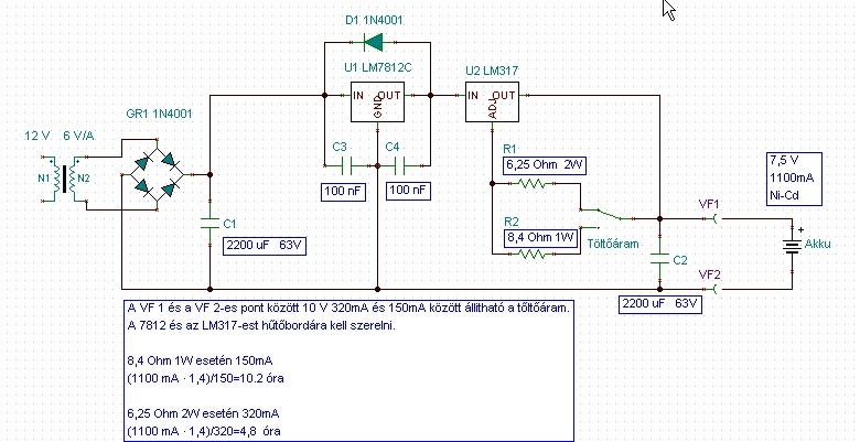 Végeredményében melyik változatnak ál neki az ember az mindegy. A 7812 megoldja a stabil tápfeszt. Az LM317 pedig a tölőáram-ért felel.