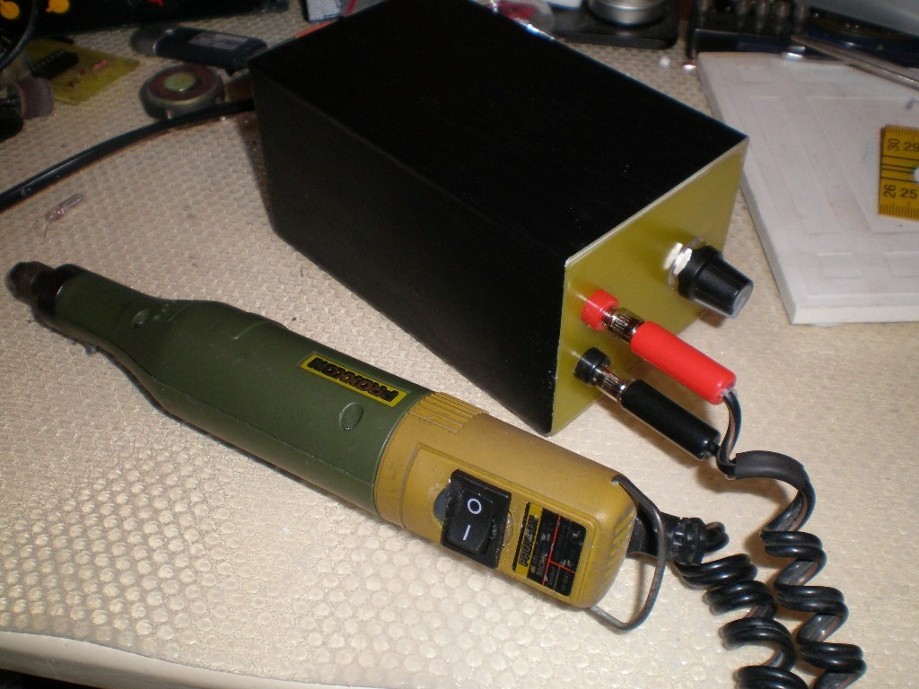 A fordulatszabályzója nem működött, a csapágyából már hiányoztak a golyók, a tokmánymenetet is megszadizták kicsit, és nem volt befogópatronja, de egyébként nagyjából mindene megvolt ömlesztve egy zacskóban. A mechanikai részhez kellett egy csapágy, és egy befogópatronsor, és a menetet kicsit kiigazítottam. A fordulatszabályzója tirisztoros volt, és azokról sok jót nem olvastam a neten, így beraktam egy billenőkapcsolót a szabályzó helyére. Tápegység meg amúgy is kellett hozzá, mert felújítás után labortápról próbálva alacsonyabb fordulaton nem volt nyomatéka, így építettem egy PWM szabályzós FET-es szabályzót, és egy trafó mellé bedobozoltam. A kapcsolást az elektrotanyán találtam: LINK
