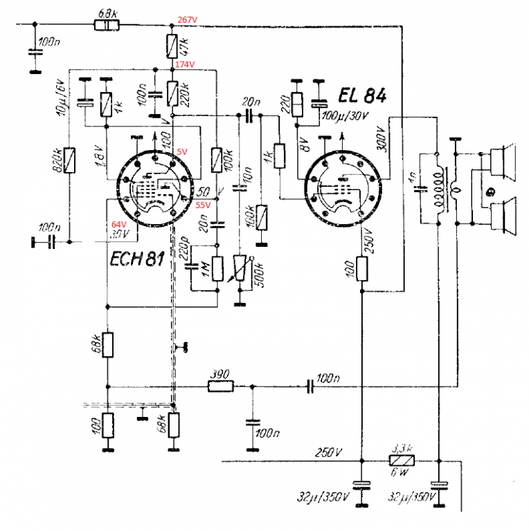 Sziasztok! Sikerült elakadnom egy barátom Terta 425-ösével. Csatolt képen látható "érdekes" feszültségeket mértem az ECH81 lábain, de tegnap délután óta nem találom az okát. A környezetében levő összes ellenállást és kondenzátort kimértem és mind hibátlanok. Csövet kicseréltem, de az se hozott változást. Valaki járt már így közületek?