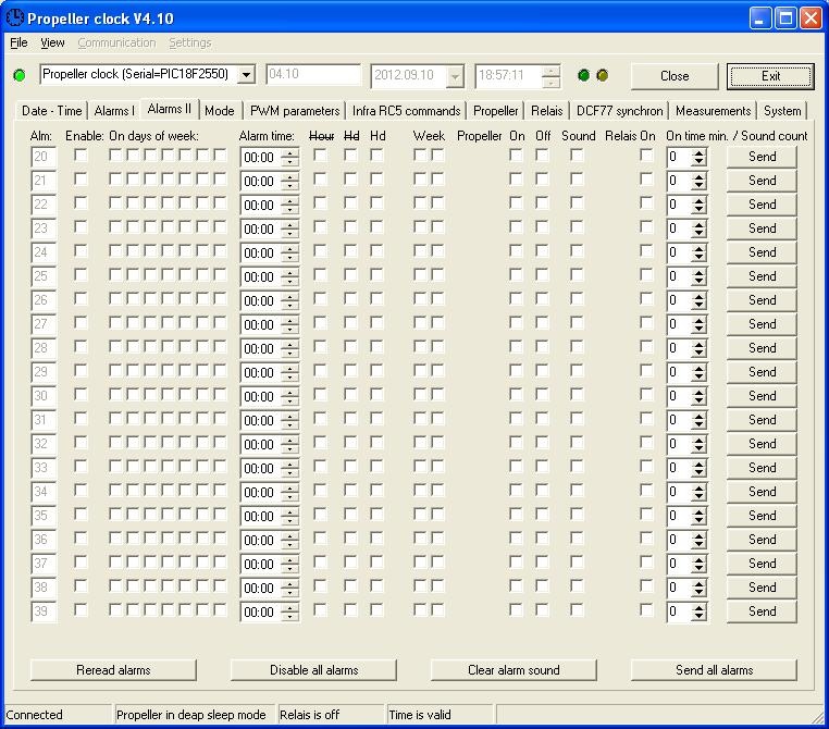 Végre, akadt egy kis idő a továbbfejlesztésre: A kezelő programon is alakítottam. Megszüntethető a rotor parancskódolási bonyodalma. A kommunikáció lehetővé teszi, hogy az összes parancsot a bázis vegye, dolgozza fel és továbbítsa a rotornak. A beállításokat ezután a bázis RTC -je tárolja, de lehetőség van/lesz állományba való mentésre is. Időkezelés: Automatikus téli - nyári idő átállás, +1..-1 órás zóna eltérés kezelése a DCF időhöz képest. Ébresztés: Ünnepnap kezelés (Húsvét és Pünkösd is), páros páratlan (ISO) hét kezelése. Kontroller típustól függően 20 vagy 40 ébresztési időpont. PWM: Rotor fényerő és sebesség szabályzás (időzített és fénymérésen alapuló is), DCF77: Vételi statisztika 24 órára visszamenőleg. System: Programból állítható infra kódok, soros vonali sebesség, TxD és RxD polaritás (ha a kontroller támogatja). Közös kezelő program az összes kommunikációra képes bázishoz (USB és a soros porttal rendelkezőre is): USB: 16F1459 (végre belefért), 18F14K50, 18F2550, 18F2455 Soros: 16F1825 (belső órajel miatt DCF77 szinkronizálás szükséges), 16F1827, 18F1729, 18F14K22, 18F2420, 18F2520, 18F2620. A hozzászólás módosítva: Szept 10, 2012