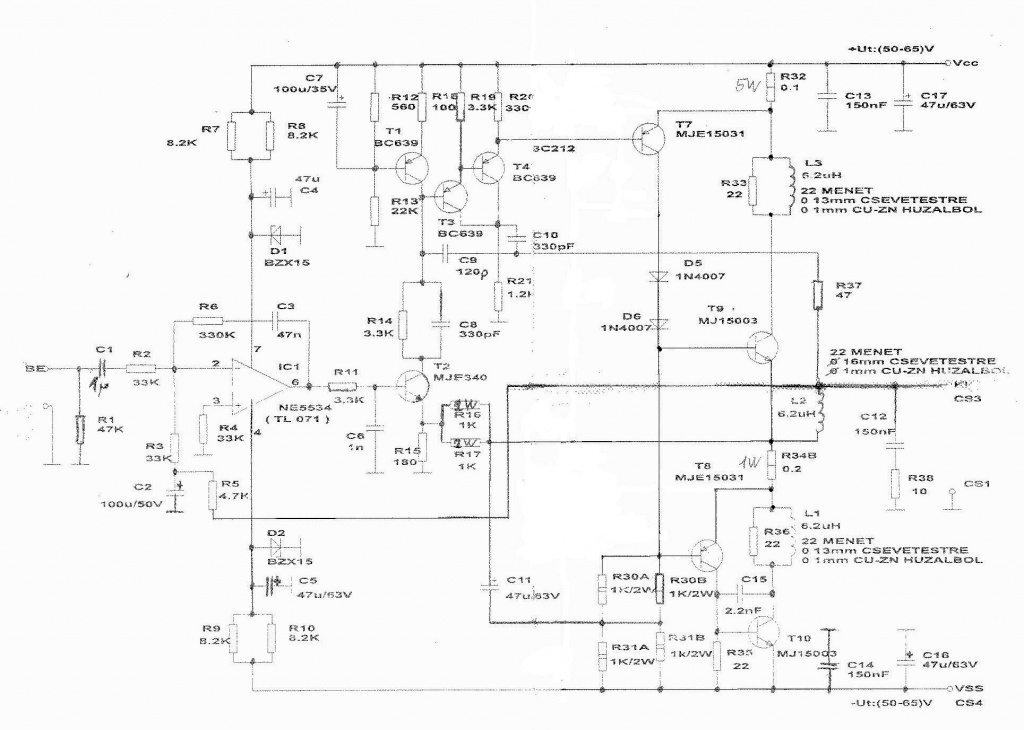 , le is rajzolom az egészet hogy nehogy el felejtsem . Akkor marad a 3 pár tranyo, és igazad van a T5-T6-os tranyok felelnek az áramkorlatért, én néztem el itt a dolgokat. Még egy útólsó kérdés, -ha párhuzamosítom a vég tranyokat, esetemben Mj 15003-asokkal, megfelelő lesz a 0,22ohm-os ellenállás-ok minden tranzisztor emitterére?.