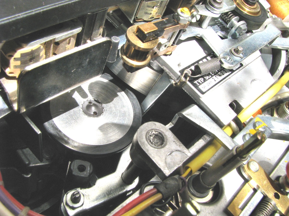 Mert a következő a tényállás, először is: nyomják Krahácsot, majd a 3034a képen a kerék tengelyét tartó műanyag elem (ezen az oszlopon rögzítődik a támasztó lemezcsík, 3027a kép fentebb) és a kerék közötti távolság 4,5 mm, aztán van egy függőleges lemez ütköző, úgy 5 óra tájban a réz görgőtől (ami 4 mm-re ér a kerék alá, 3038a kép). Itt 2 mm a távolság. A 9,5-ről 19-re vagy visszaváltáskor mindig nekiütközik a közvetítő kerék, mielőtt a lendkerékhez ér, közel ugyan ezen a pályán kapcsolódik a lendkerék oldalához ebben a két tartományban. A többinél nem, mert akkor lentebb közlőkerekezik, más lépcsőkön!