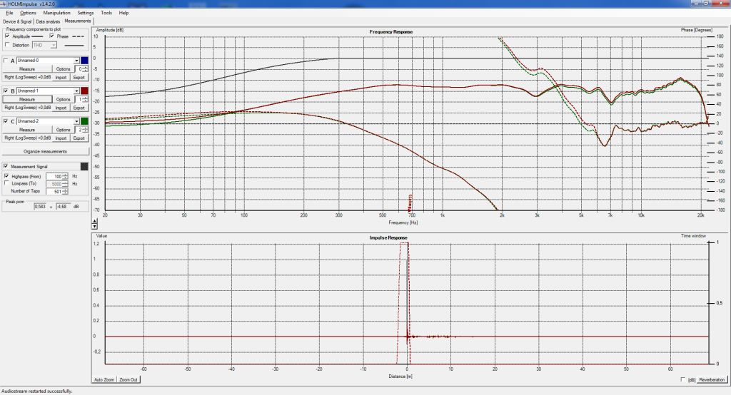 Méricskéltem és az eredmények alapján tényleg kicsit hangosabb amikor kiiktatom azt a részt. A képen bordó színű mérés a kiiktatott, a kék az eredeti.
