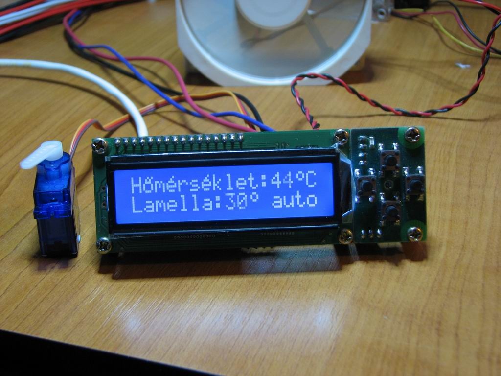 Végre befejeztem az eddigi legnagyobb pic-es projektemet, mely egy számítógépházban fogja a szellőzést szabályozni. A lelke egy 16F1938 mely 20Mhz-es kaviccsal ketyeg, manuális mód mellett egy lm35dz hőmérő szenzor vagy feszültség alapján szabályozza a servo mozgását, mely egy lamellasort fog nyitni zárni a szabályzási értékeknek megfelelően. Beállítható a szabályzási küszöbérték, mely hőmérséklet mérés esetén 20°C-tól 60°C-ig állítható, feszültségmérés esetén 3V-tól 9V-ig, a beállított érték felett kezdi csak el szabályozni a lamellák nyílásszögét. Beállítható a szabályzási meredekség, hőmérséklet mérés esetén 0,25°C/°-tól 2,5°C/°-ig 0,25-ös lépésekben, feszültség mérés esetén 0,25V/5°-tól 2,5V/5°-ig szintén 0,25-ös lépésekben. Beállítható a lamellák maximális nyílásszöge ami 30°-tól 90°-ig állítható, továbbá az lcd kijelző fényereje pwm segítségével 0-100% között. Manuális módban a bemenet választás és a szabályzási értékek menüpontja nem elérhető. Van még négy darab rejtett menü, amihez a set gomb hosszabb lenyomásával lehet eljutni (5,10,15,20s), az elsőben alaphelyzetbe lehet állítani az áramkört, a másodikban egy villog ledet lehet bekapcsolni, ezek a fejlesztés közben jöttek jól, a harmadik menüpontban a servo elmozdulási szorzóját lehet beállítani, hogy a lamellák tényleges elmozdulási szöge megegyezzen az lcd-re kiírt értékkel, végül pedig a gombok sorrendjét lehet megváltoztatni. Alap esetben balról jobbra set, plusz, minusz, exit, átállítva: balról jobbra: minusz, set, exit, plusz. A működéséről készült egy kis video. További képek elérhetőek a picasa albumomban Bari A hozzászólás módosítva: Okt 17, 2012