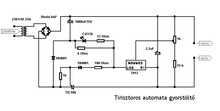 - A trimmerel lehet beállítani a töltési végfeszültséget a 14,2..14,5V értékre. Itt leszabályozza a töltőáramot az áramkör. - Ha megnyomod a gombot, akkor visszajön a töltőára, mert a tirisztor vezérlését nem tiltja a tranyó. üdv! proli007