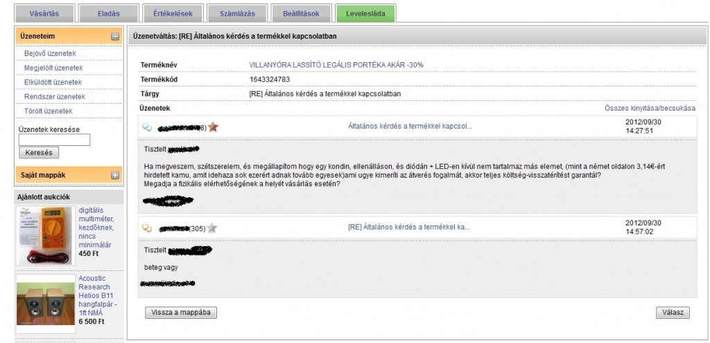 Idézet: „Tisztelt ....! nem teszek fel fotót,(a hamisítók és a csalók miatt) a termékleírásban és a 200 darab pozitív értékelés után amit a termékből eladtam,szerintem magáért beszél. méretei fel vannak tüntetve. Üdvözletem és szép estét! - ......” Meg a szakmai része is: Idézet: „Tisztelt ......! Értem...., akkor semmi gond veled, csak hát sok a barom, ezért olcsó nálunk a marhahús (Megpróbálnak egyesek úgy beállítani téged, mint egy sötétben bujkáló ellenséget, csak azt nem tudom, hogy akkor miért vásárolnak, miért nem lapoznak tovább?) Én is gondolkodóban vagyok a termék megvásárlását illetően, de rátérve a szakmai oldalra, egyelőre még abban nem hiszek, hogy a koszinuszfí" javításával ekkora eredmény elérhető lenne. (A Kandón végeztem, igaz, nem kimondottan erősáramú szakon...)Na, szóval, gondolkodom... ”